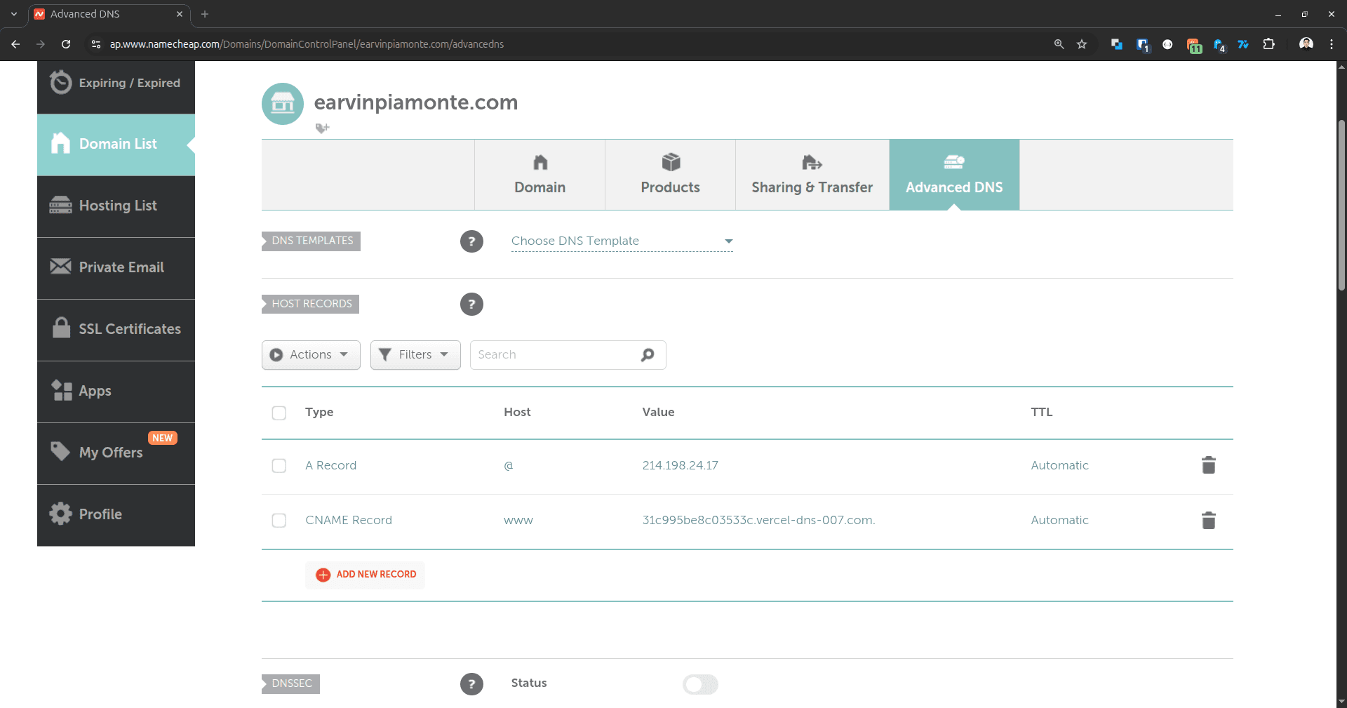For earvinpiamonte.com, I have A type for the host @ with a corresponding IP. And for www.earvinpiamonte.com, I have CNAME type for the host www.