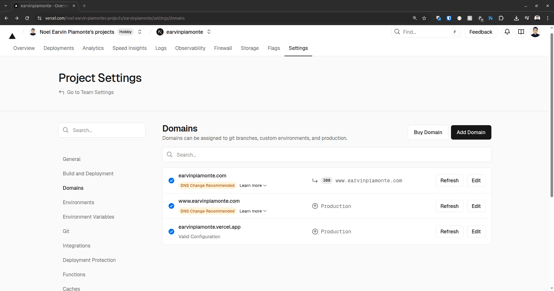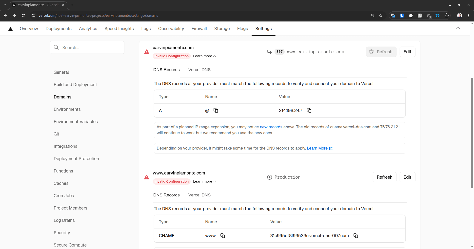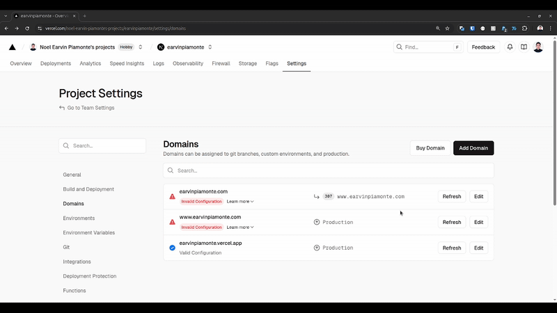 After the update of name servers type in Namecheap, I went back to my domain settings in Vercel and removed the existing earvinpiamonte.com and www.earvinpiamonte.com.